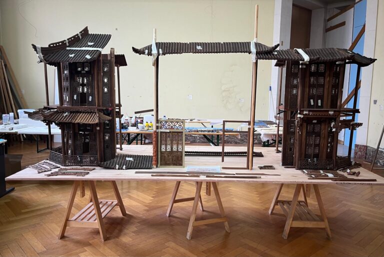 Après l’Exposition universelle de Paris en 1900 et lorsque le roi Léopold II commanda à l’architecte Alexandre Marcel de concevoir et de construire le Palais chinois, ainsi que son annexe et la Tour japonaise, il fit réaliser une maquette du palais par des artisans de Shanghai à l’échelle 1/10. Cette maquette en bois, qui présente de nombreux détails, a été retrouvée par chance dans l’annexe du Palais chinois et entreposée longtemps au Musée Art & Histoire en pièces détachées. Grâce à la collaboration du Musée Art & Histoire, de la Fondation Roi Baudouin et du Fonds Jonckheere, la restauration de cette maquette a débuté en novembre 2024 et s’est achevée en juillet 2025.