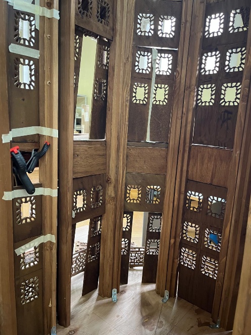 Nous recevons de Gwenaëlle de Spa les portes du rez-de-chaussée de la partie centrale que nous teintons et positionnons. Nous recevons également un essai de colonne qui devra être affiné.