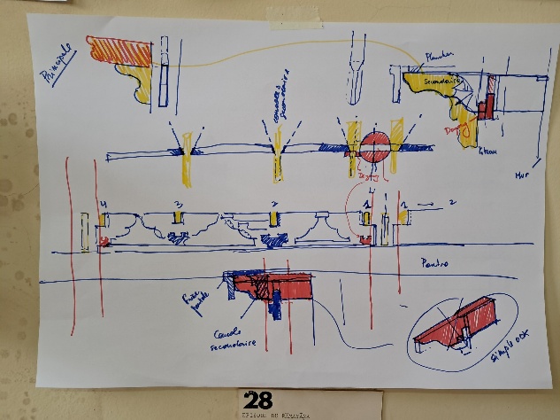 Après avoir analysé les pièces en notre possession dans le but de reconstituer les frises des balcons entre le rez-de-chaussée et le premier étage, nous constatons qu’il manque une console dont nous avons établi la place et les mesures. Nous la réaliserons sans détails, afin de ne pas être dans l’erreur.
