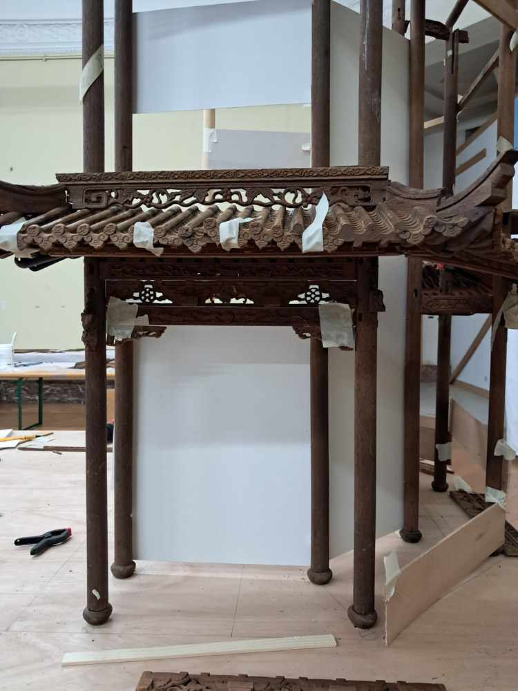 Chers tous, Suite à l’agréable moment que nous avons passé ce jour au Cinquantenaire devant la maquette du pavillon chinois, voici un résumé de ce que nous nous sommes dit : – Au vu des lacunes, il est impossible de refaire la maquette à l’identique. Une simplification structurelle et une interprétation des manques s’imposent. Exemple : nous n’avons pas d’idée précise avec ce que nous avons, de la structure de la charpente. Nous élaborerons une structure qui permettra au toit de tenir. Il s’agit d’une partie qui ne sera pas visible. En ce qui concerne les parties visibles, nous allons faire un mix de moulages des pièces qui existent, dont nous avons besoin en plus grand nombre, et des impressions 3D en vectorisant des photos du carnet de Shangaï. Nous avons décidé également de donner au tout la même patine c’est-à-dire la patine naturelle du bois tel qu’il est actuellement. Nous laisserons les « accidents » (griffes, éclat…), notamment sur les toitures. – Nous n’allons pas essayer de donner à la maquette un côté « maison de poupée ». Il n’y aura donc pas d’éléments ajoutés à l’intérieur, tels que parquet, miroirs, luminaires… Elle restera une maquette préalable à la construction de la partie chinoise du palais chinois. Dans le même ordre d’idée, nous essaierons de nous baser en priorité sur la photo et les éléments de la maquette. Lorsque ce n’est pas possible, nous nous référerons en dernier recours à la situation existante. Par rapport aux éléments inexistants qui nous posent encore des problèmes (par exemple, les statuettes de toiture pour lesquelles nous n’avons pas d’idée précise), au lieu d’une interprétation qui serait trop fantaisiste, nous ne les ajouterons pas. – Pour le transport, la maquette sera divisée en 3 parties : les 2 parties latérales et la partie centrale. – Grâce à Nicolas, à son temps et à ses connaissances de l’architecture chinoise, nous avons compris beaucoup de choses quant aux structures architecturales traditionnelles, l’iconographie des bas-reliefs, ainsi que les représentations des éléments décoratifs des sous-toits (invisibles sur les photos). De plus, sa connaissance de la langue chinoise, utiles pour les nombreuses inscriptions, ainsi pour le positionnement des frises avec représentations d’animaux, nous a été et nous sera d’une aide plus que précieuse. Les but étant de ne pas, par ignorance, faire des interprétations ou des placements erronés. – Nous aurons besoin d’aller in situ vérifier les empilements des Dogons (structures de répartition des charges de la toiture) qui, heureusement, dans la maquette ne sont que décoratifs. – Nous avons découvert les pièces des piliers de construction, qui encadrent les portes, ce qui est une grande avancée également. Il faudra que nous les refassions. Avant de faire appel à un menuisier indépendant, nous demanderons à Nathalie Vandeperre si l’atelier de menuiserie du musée peut les réaliser pour nous. – Demain matin, nous réaliserons un inventaire avec métré et photos de référence des éléments manquants des deux parties latérales, afin de demander une estimation de prix ainsi que la faisabilité de réalisation en impression 3D à deux spécialistes différents, dont Gwenaëlle de Spa qui travaille dans un Fablab. – Pour le moment, nous nous concentrons sur les parties latérales et les toitures. Mais nous gardons un œil sur la façade principale et nous entamerons rapidement un travail de recherche sur le sujet. Thibaut De Coster |