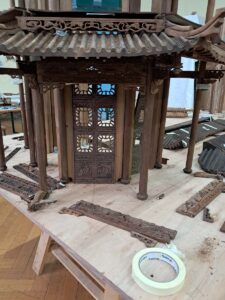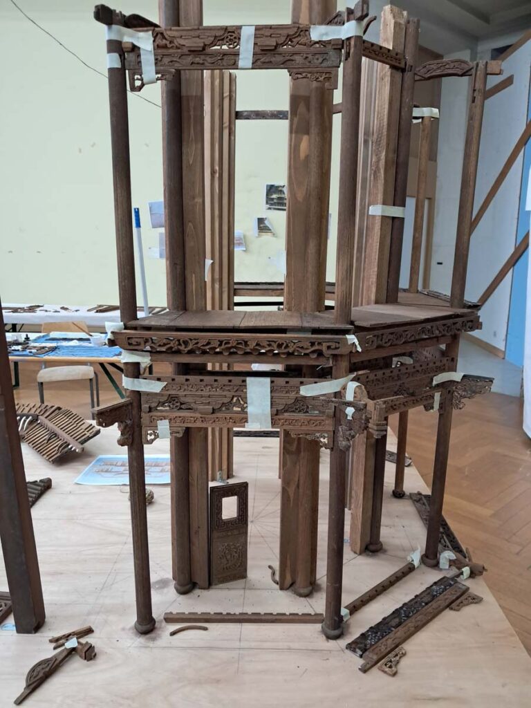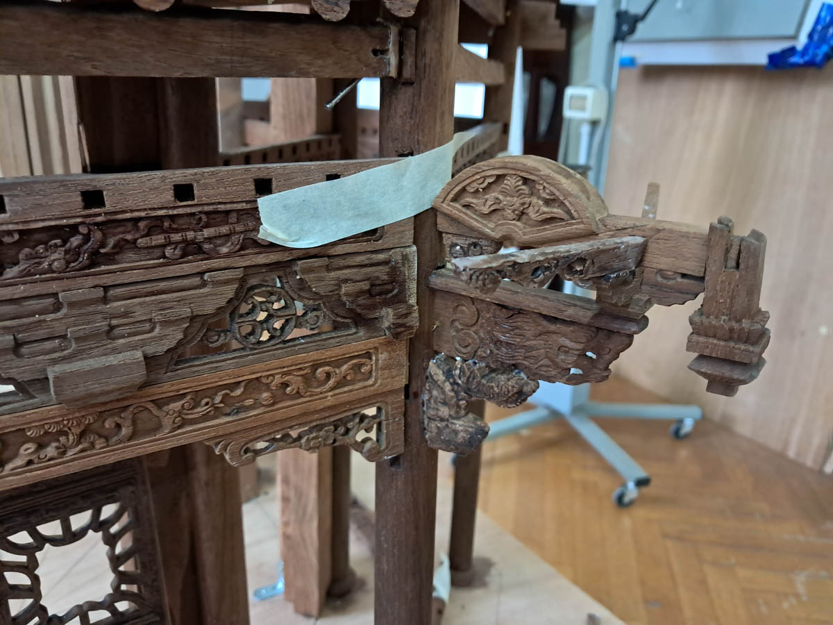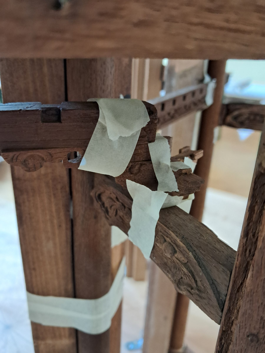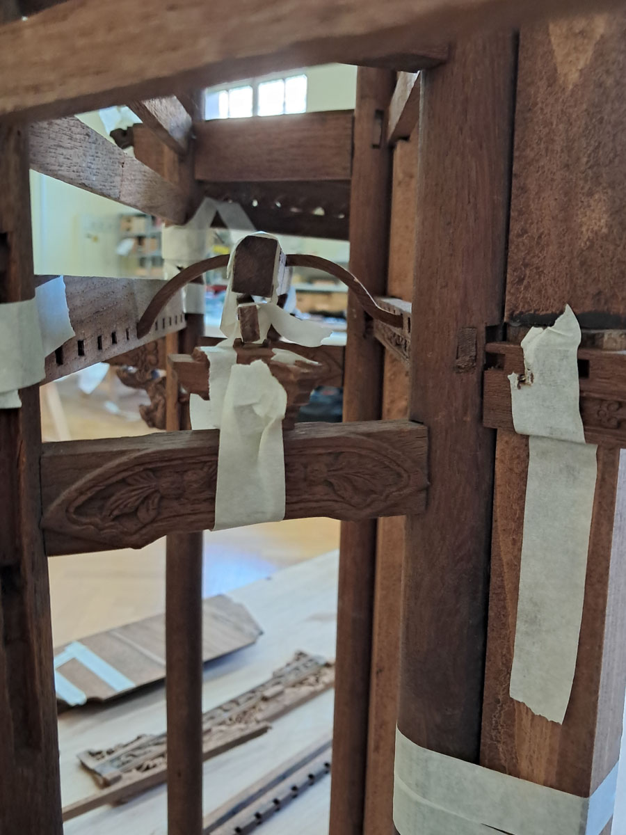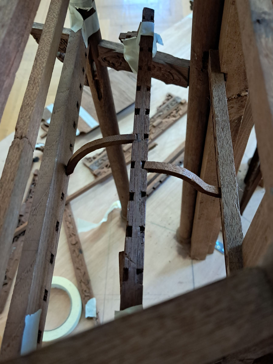 Nous fixons ensemble les frises et les consoles et les ajustons. Nous ne les fixons pas définitivement car l’accès doit encore être dégagé pour positionner les portes et les structures en « S » et en « C » qui s’accrochent aux frises intérieures.