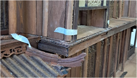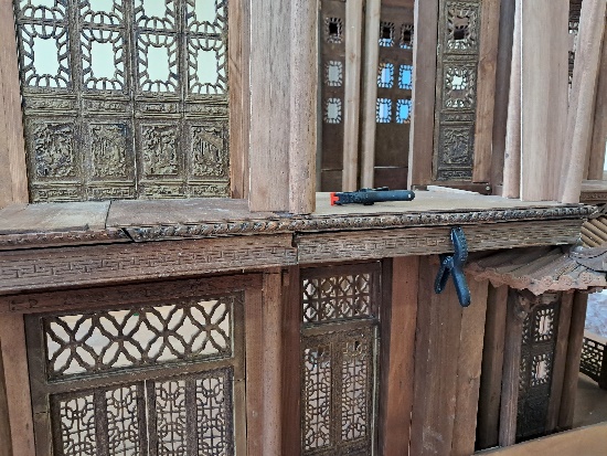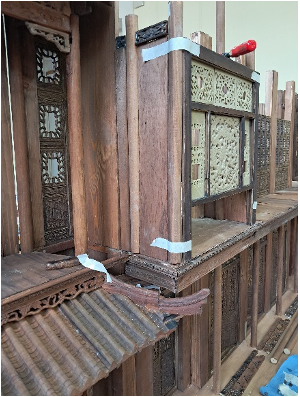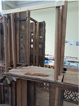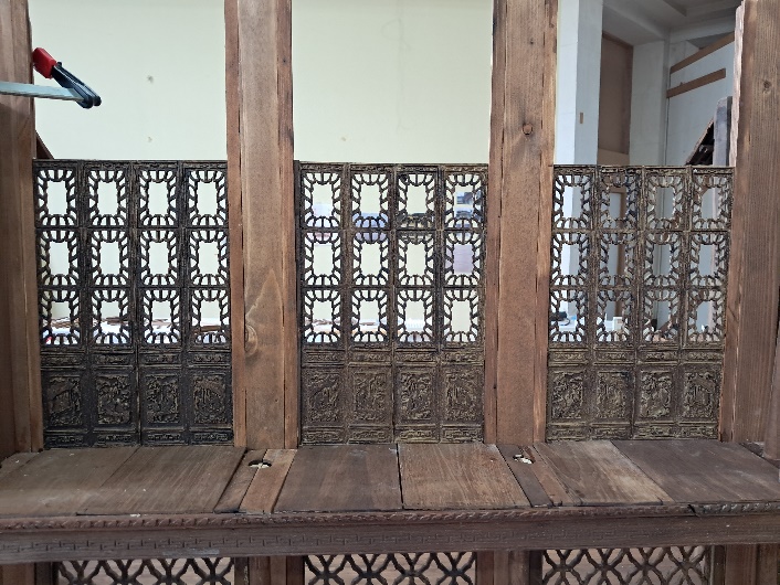 Nous découpons les planches du balcon de la partie centrale, les teintons et les fixons.