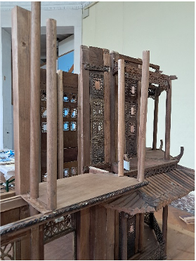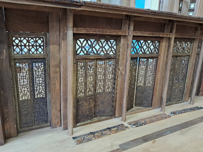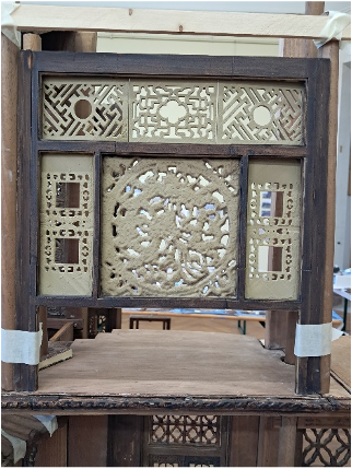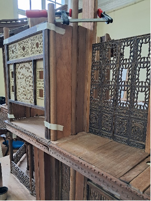 Nous ajoutons des montants en balsa à la partie ajourée de gauche, afin de pouvoir ajuster le châssis aux colonnes de la structure, et nous les teintons.