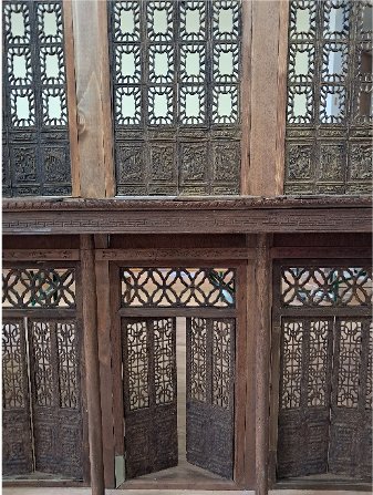 Nous ajustons et accrochons les châssis des portes-fenêtres du premier étage de la partie centrale.
