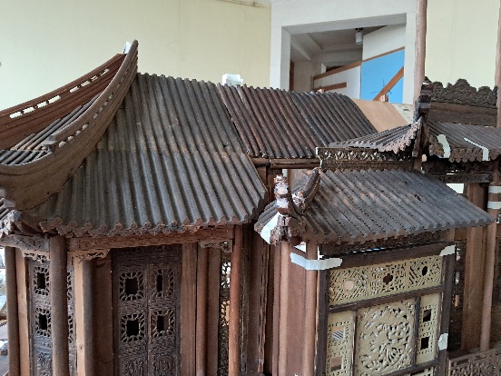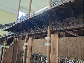 De plaatsing van de opengewerkte friezen en uitstekende dogongs onder het kleine dak van het centrale gedeelte wordt vastgezet.