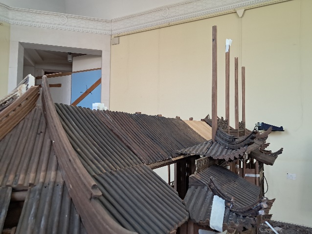 Nadat wij ze hebben gegoten en gekleurd, passen wij de harsgedeelten aan de dakpannen van het hoofddak aan. Wij besteden bijzondere aandacht aan de elementen die het mogelijk zullen maken de maquette in drie transporteerbare delen te verdelen.